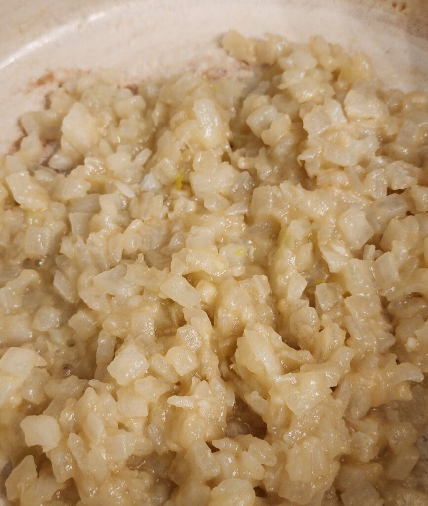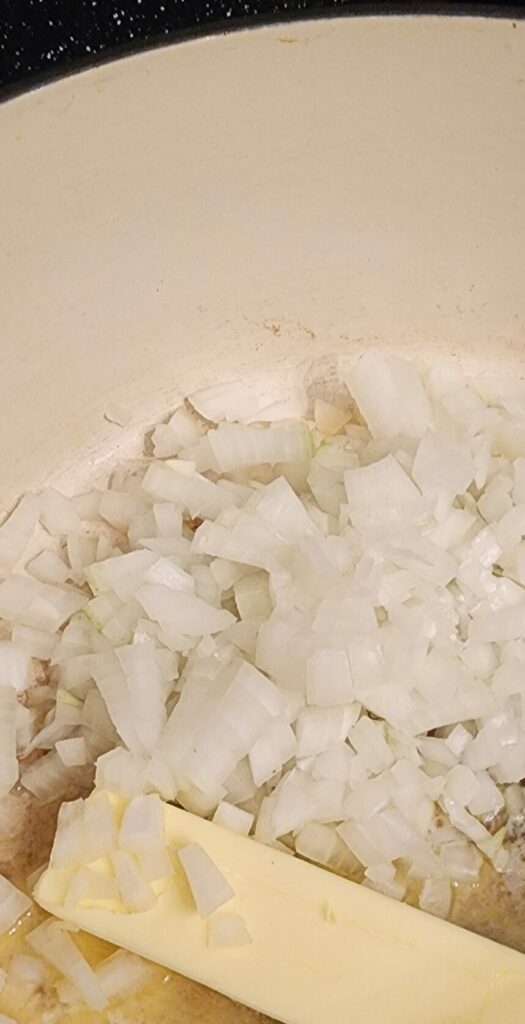 • Melt butter over medium heat. Add onion and cook until translucent, then add garlic and cook for 1 min.