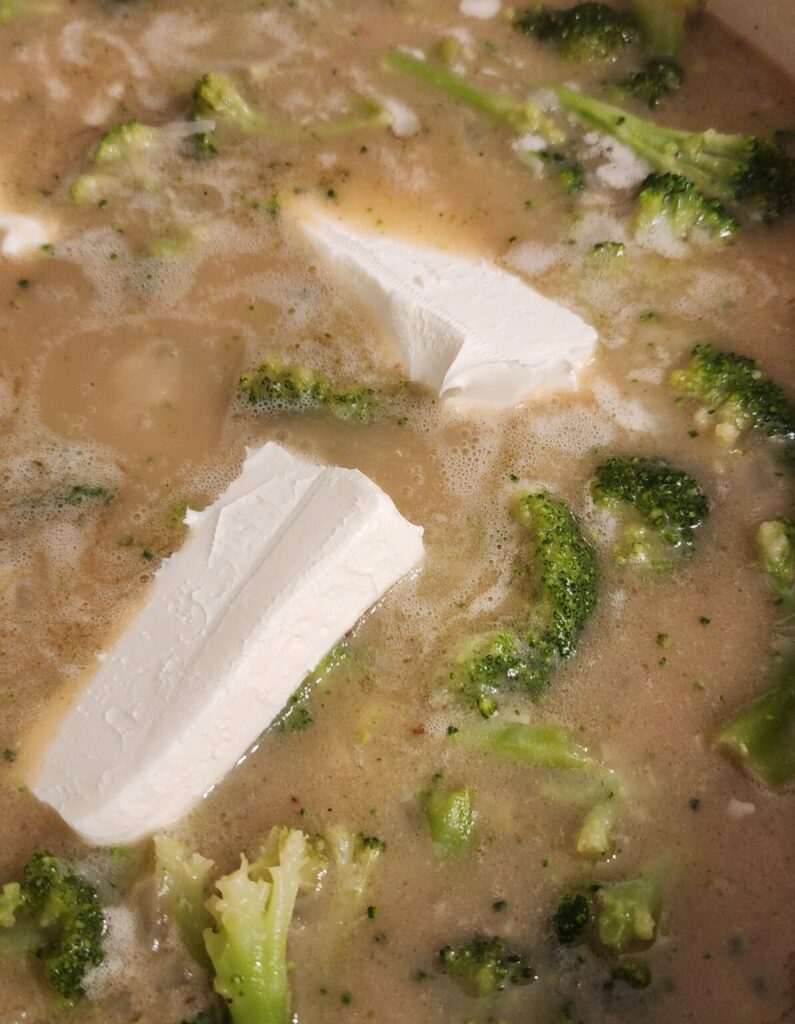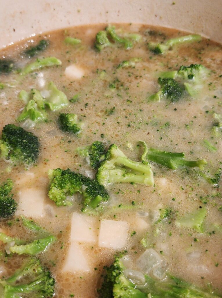 Potatoes – potatoes add extra thickness to the soup. I like to cube them small (1/2″ cubes) because they blend up easily with the broccoli. If you want to leave large broccoli pieces, you can shred the potatoes fine to add the texture without needing to blend it.