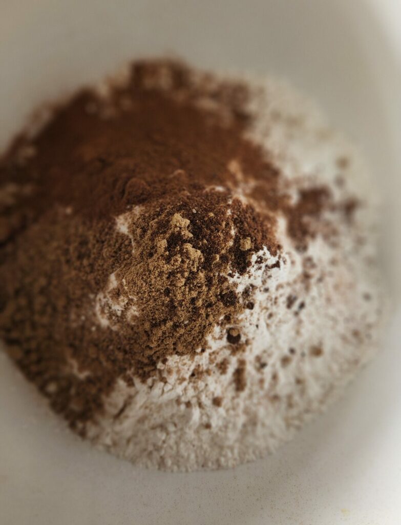 • In a mixing bowl, combine the flour, salt, baking soda, cinnamon, ginger, and nutmeg.
