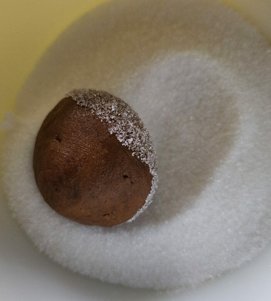 • Form the dough into walnut sized balls and roll them in the bowl of sugar to coat.