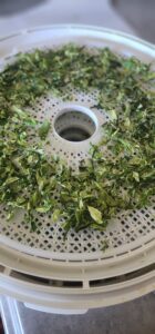 In our gardens here, we are currently growing about 200 onions. We don’t grow enough onions (yet) to make white onion powder, but with these tops, we make use of what would be composted. In early summer, we trim our onion tops to keep them from falling over – a sign to the bulb to stop growing. The pollinators love the blossoms, so I do let a few go to seed every year for them (and to save the seeds).