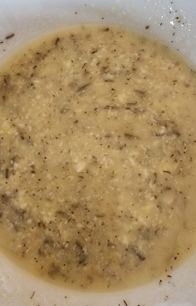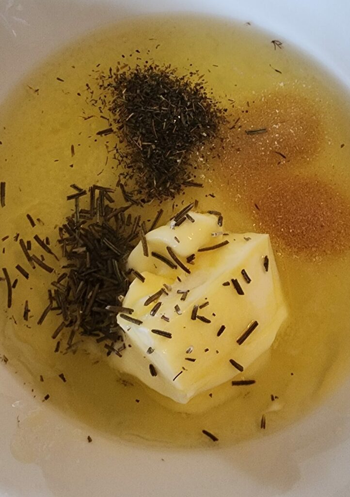 • In a small bowl, mix together softened butter, olive oil, garlic powder, onion powder, rosemary, and thyme.