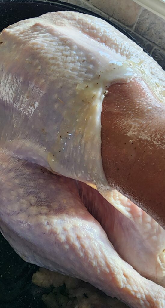 • Slide your hand underneath the turkey skin and gently move the turkey skin away from the breast meat. Take half of the rub and place it underneath the turkey skin over both turkey breasts. The remaining half, rub over the entire top of the turkey.