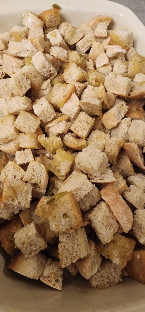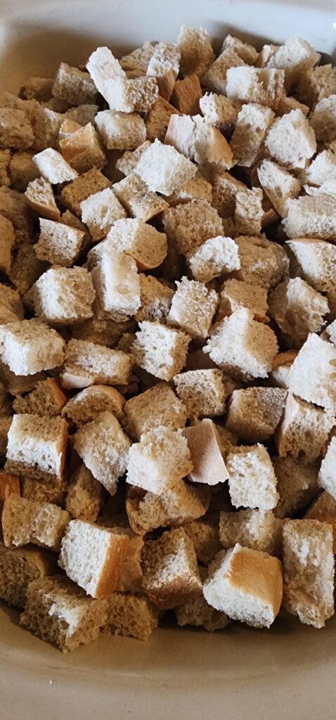 - The day before, cube bread and lay out on a sheet pan, cover with a tea towel and allow to dry out. You can also dry them in a 300℉ oven for around 10 minutes the day of.